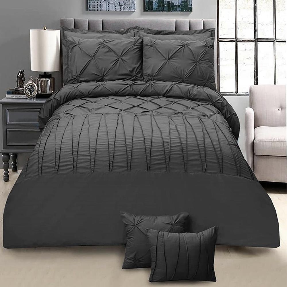 Create a luxury oasis in your bedroom or guest suite with this Livia charcoal 8 Piece duvet cover set. Elegant pinch pleated designing creates a blossom theme. Perfect for anyone with allergies looking to breathe and sleep easy, especially children and the elderly. Transform your room into a relaxing retreat with this beautiful Livia charcoal bedding set.
