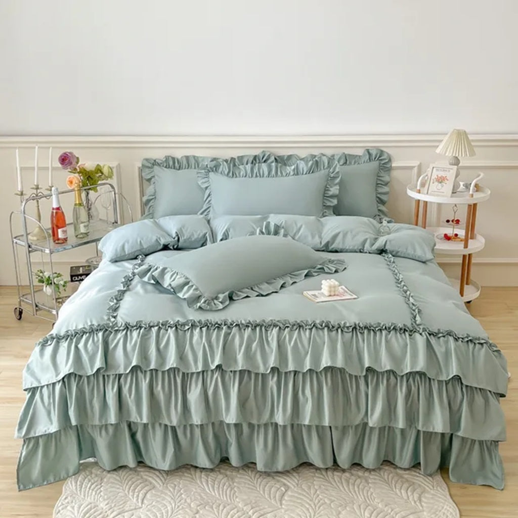 Highly quality Bedding sets in Ruffle design in Fortnum Green color. Give an elegant touch to your bedroom.