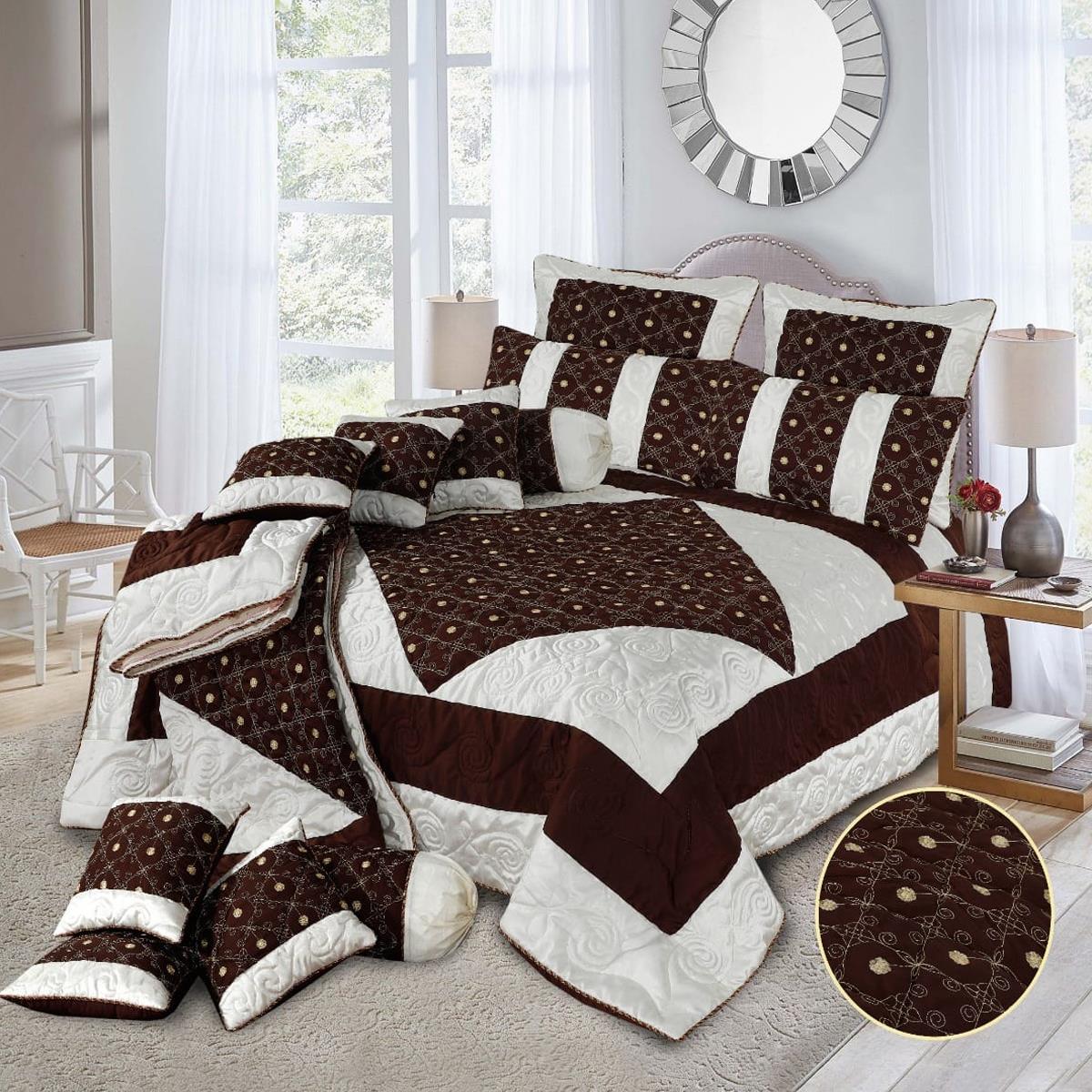 Diamond 14 Pcs Silk Quilted & Embroidered Brown Bedspread Set