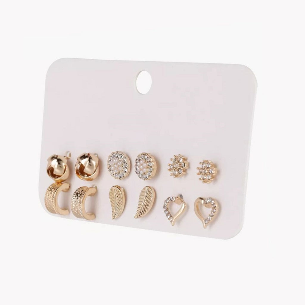 These six stud earrings pairs in three different stones are timeless and easy-to-wear, they sparkle with clear crystals and milky stones in a classic tone setting. Can be worn together and separate.