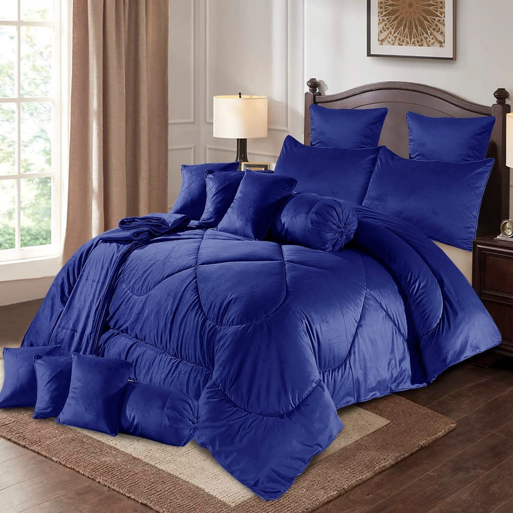 Eutony 14 Pcs Velvet Blue Bed Set with Filled Comforter