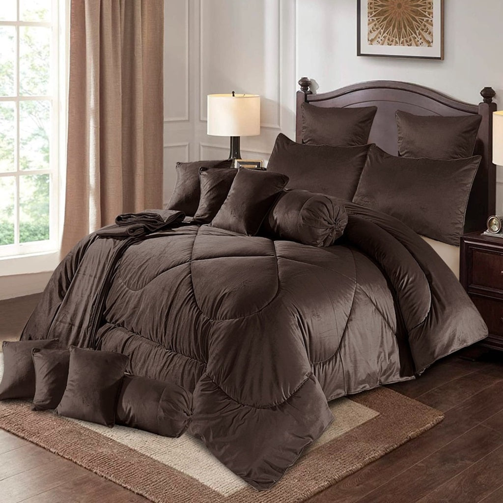 Eutony 14 Pcs Velvet Brown Bed Set with Filled Comforter