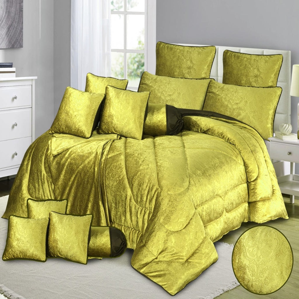 The 14 piece velvet comforter set introduces a taste of contemporary luxury to your bedroom decor. Featuring rich tones and textures accented with unique designs, beautiful colors and amazing texture, this set adds an upscale look to any bedroom. This comforter set blends seamlessly with your bed to create a uniform and inviting look. When you are looking for a gift idea for registries and showers, this 14 piece comforter set is a smart choice.