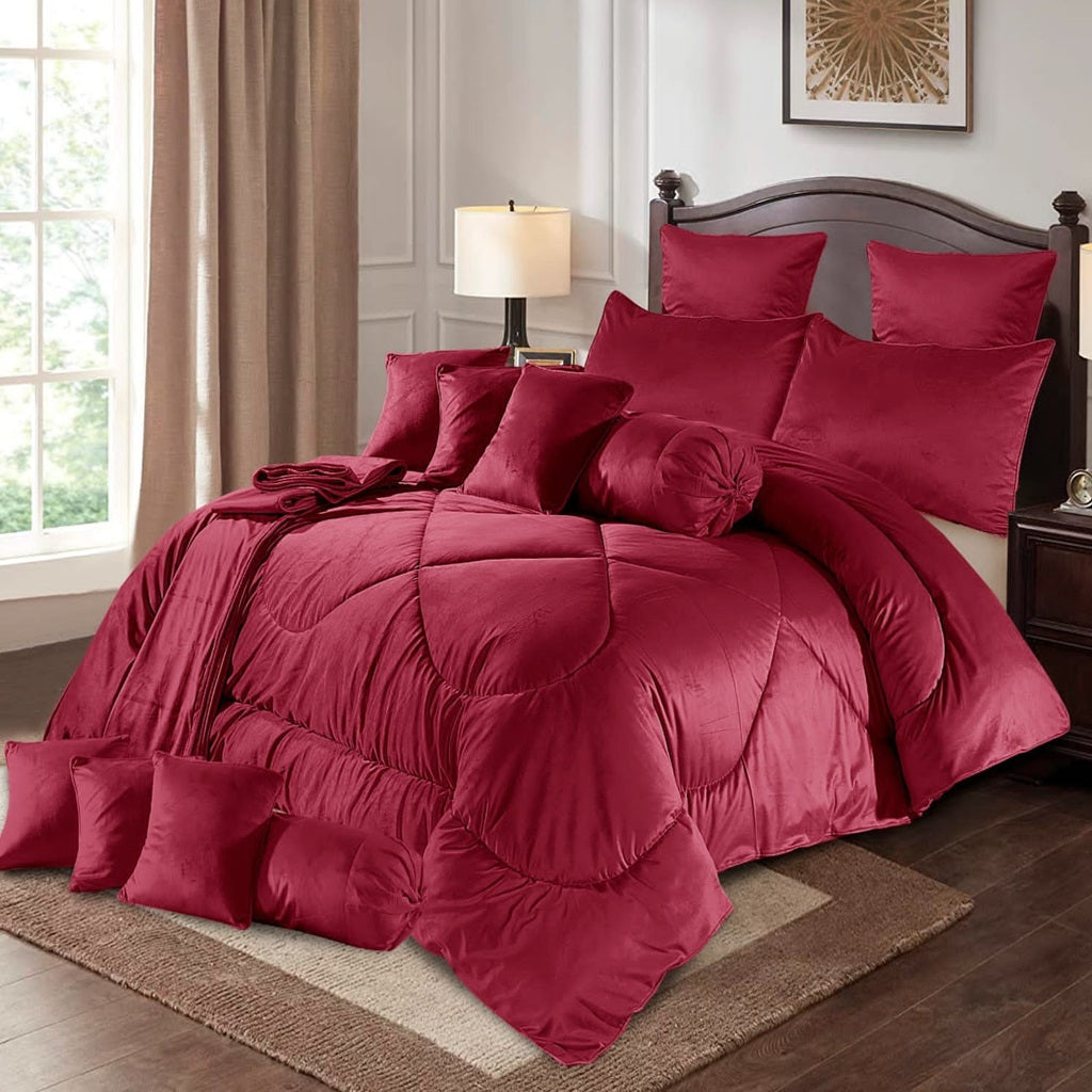 The 14 piece velvet comforter set introduces a taste of contemporary luxury to your bedroom decor. Featuring rich tones and textures accented with unique designs, beautiful colors and amazing texture, this set adds an upscale look to any bedroom. This comforter set blends seamlessly with your bed to create a uniform and inviting look. When you are looking for a gift idea for registries and showers, this 14 piece comforter set is a smart choice.