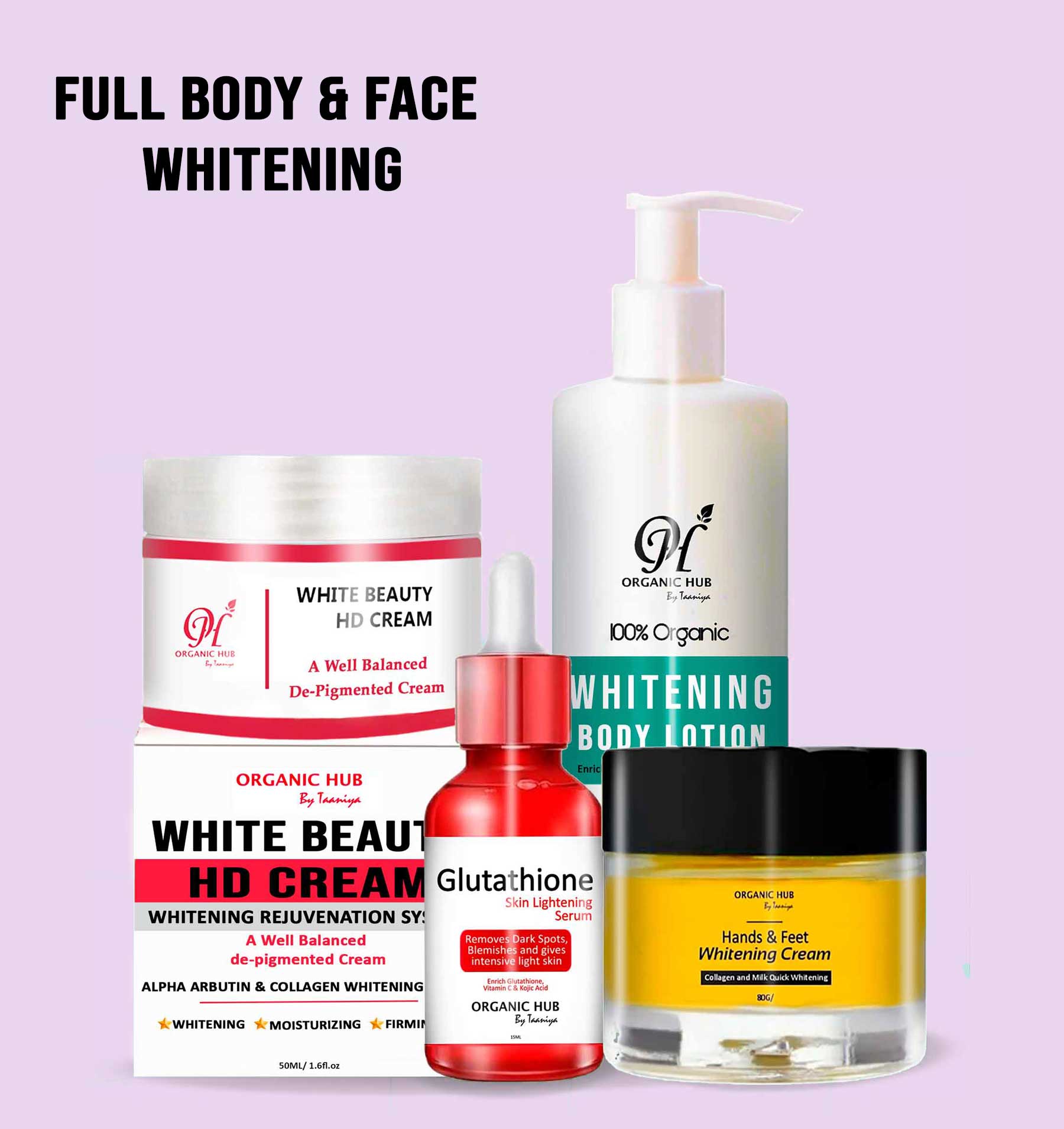 Buy Best Organic Whitening Products for face and Body in Pakistan. This Extreme Whitening Bundle contains Beat Whitening Skincare and Body care Products which helps in lightening the skin tone such as Organic hub Bestseller Night Cream Organic Hub Top Reviewed Glutathione Serum Full Body Whitening Bleaching Lotion & Organic Hub Hands ands Feet Whitening Cream