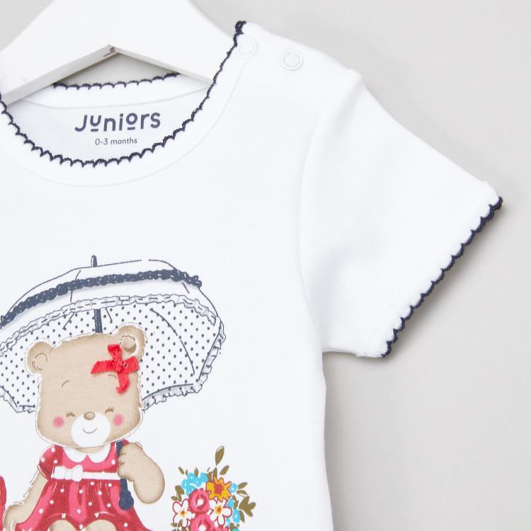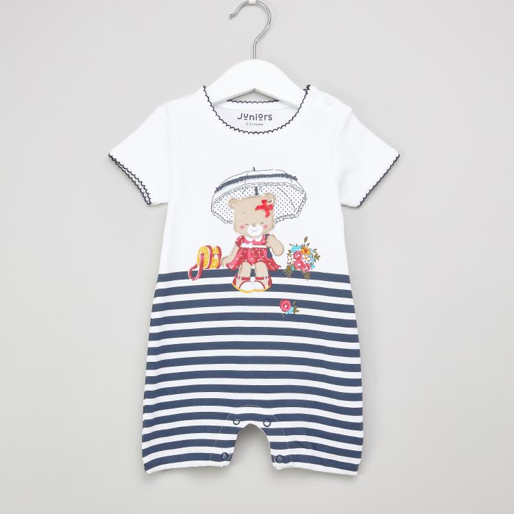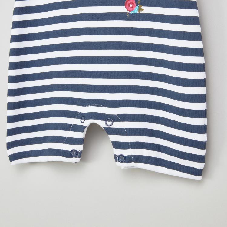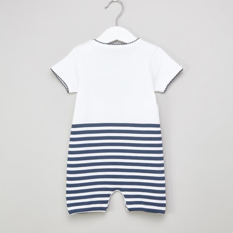 Enhanced using stripes and applique detail, this romper enhances your little boy's overall look. The fine quality material further adds to the comfort factor and the press button closure ensures fuss-free dressing.