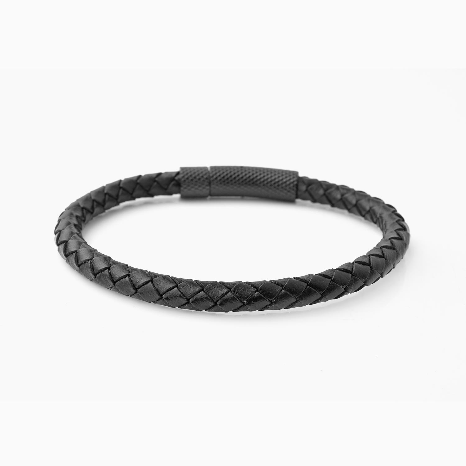 The ultimate, everyday wear bracelet, marvellous detailing and the finest materials make this an easy-to-wear accessory, whether it's to add a hint of personality when wearing a tailored suit or a rebellious touch with casual wear. Handmade from black genuine leather and engraved stainless steel matt black textured clasp, that ages well.