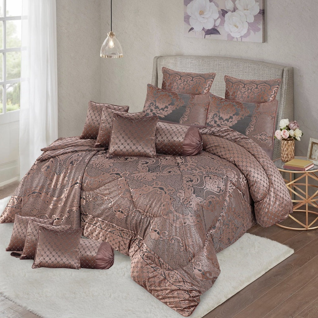 The 14 piece palachi velvet comforter set introduces a taste of contemporary luxury to your bedroom decor. Featuring rich tones and textures accented with unique designs, beautiful colors and amazing texture, this set adds an upscale look to any bedroom. This comforter set blends seamlessly with your bed to create a uniform and inviting look. When you are looking for a gift idea for registries and showers, this 14 piece comforter set is a smart choice.