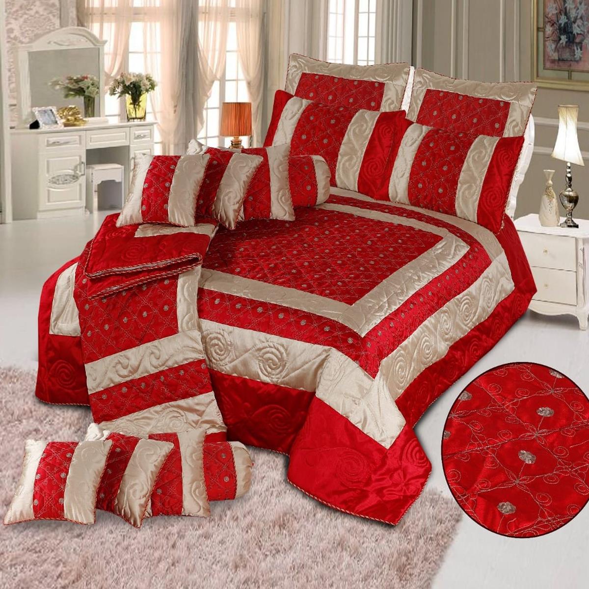 Valenti 14 Pcs Silk Quilted & Embroidered Red Bedspread Set